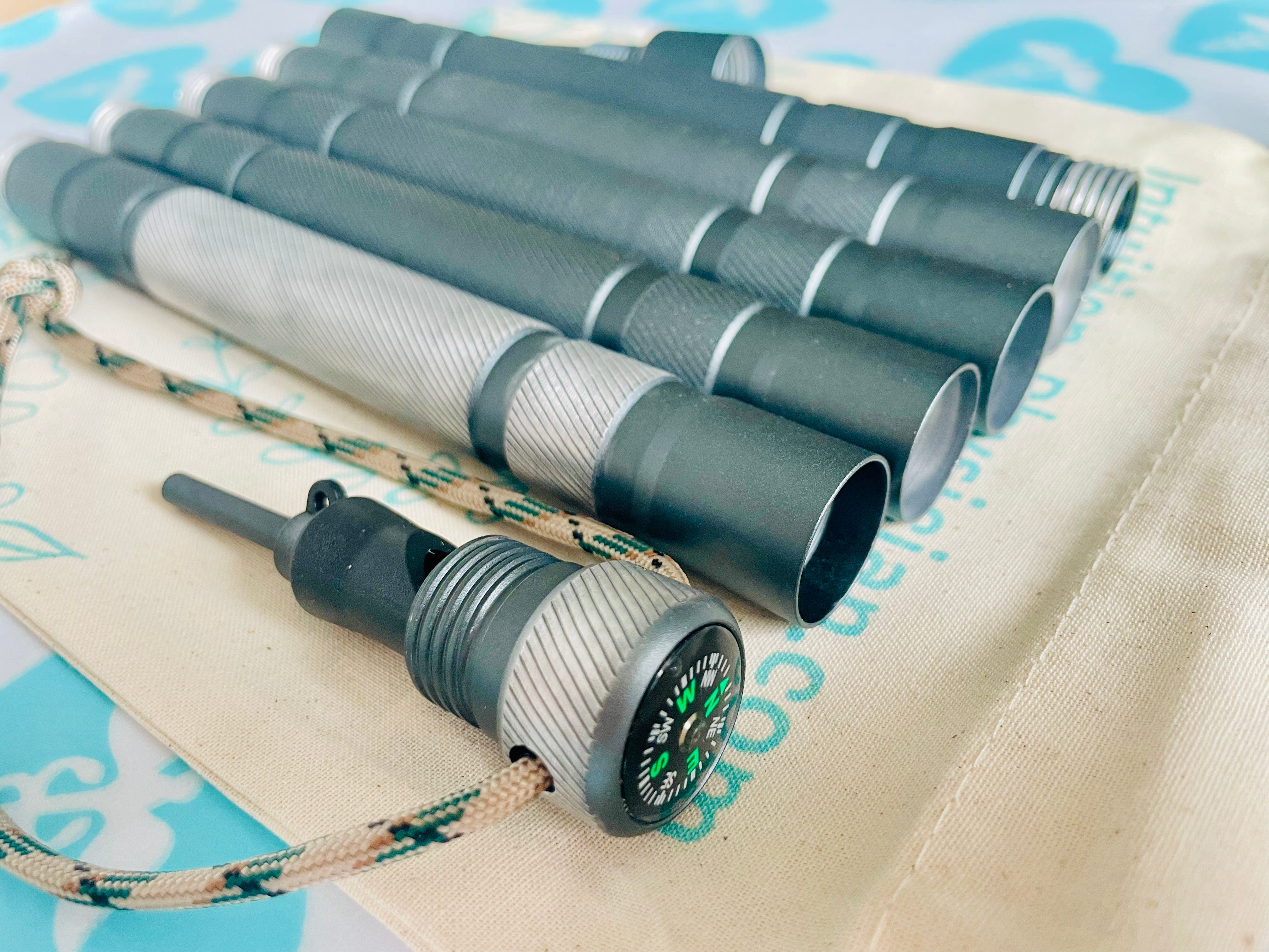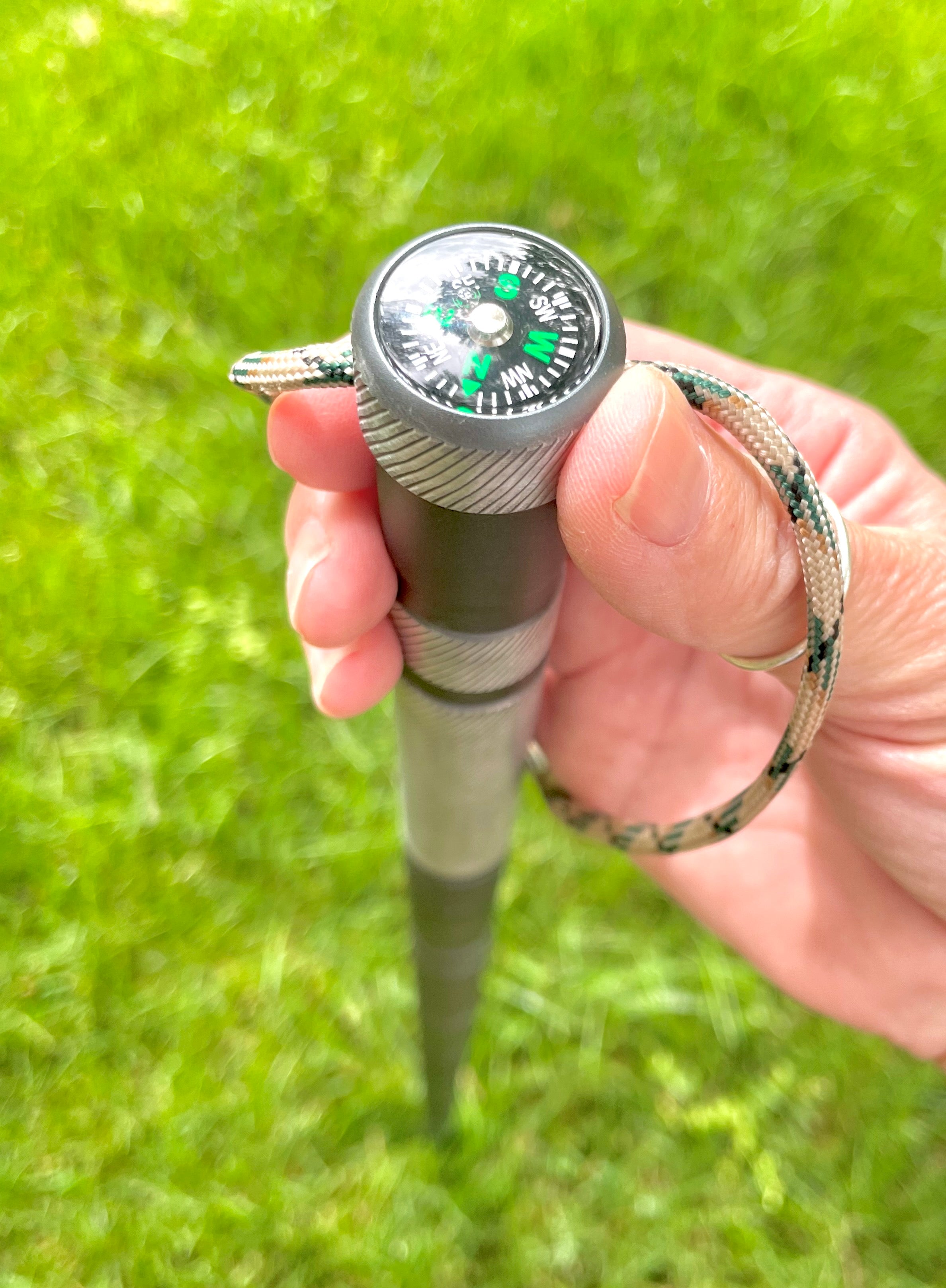 - includes a compass at the top of the handle, and a safety whistle and flint inside the handle top, as well as a wrist strap