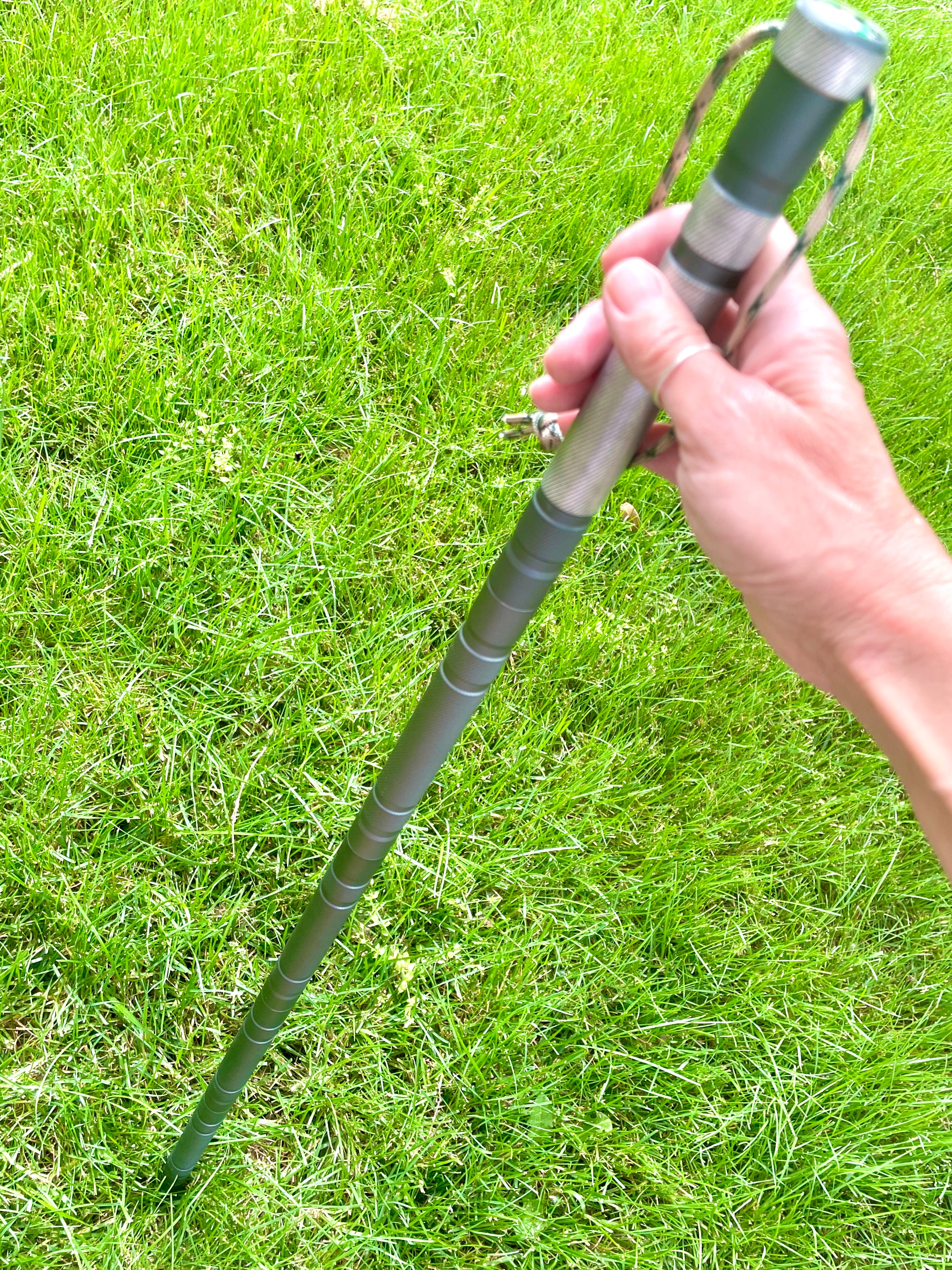 New item! A great way to be able to wear hiking boots and still be grounded, as well as for those who travel -- this extremely lightweight grounding hiking stick breaks down into 7 small pieces to store easily in the included organic cotton tote. Perfect to keep in your car to ground on long drives or slip into a backpack or suitcase for easy grounding on the go.